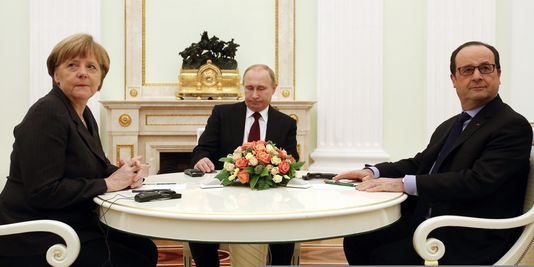 Il giorno dopo la loro visita a Kiev, il presidente francese François Hollande e il cancelliere tedesco Angela Merkel ha visitato Venerdì 6 febbraio a Mosca per presentare alle autorità russe il loro progetto per uscire dalla crisi.