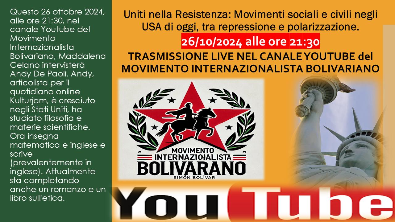 Questo 26 ottobre 2024, alle ore 21:30, nel canale Youtube del Movimento Internazionalista Bolivariano, Maddalena Celano intervisterà Andy De Paoli. Andy, articolista per il quotidiano online Kulturjam, è cresciuto negli Stati Uniti, ha studiato filosofia e materie scientifiche. Ora insegna matematica e inglese e scrive (prevalentemente in inglese). Attualmente sta completando anche un romanzo e un libro sull’etica.